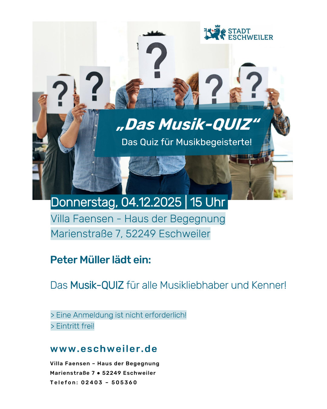 Als Veranstaltungsort dient die Villa Faensen – Haus der Begegnung in der Marienstraße 7, 52249 Eschweiler