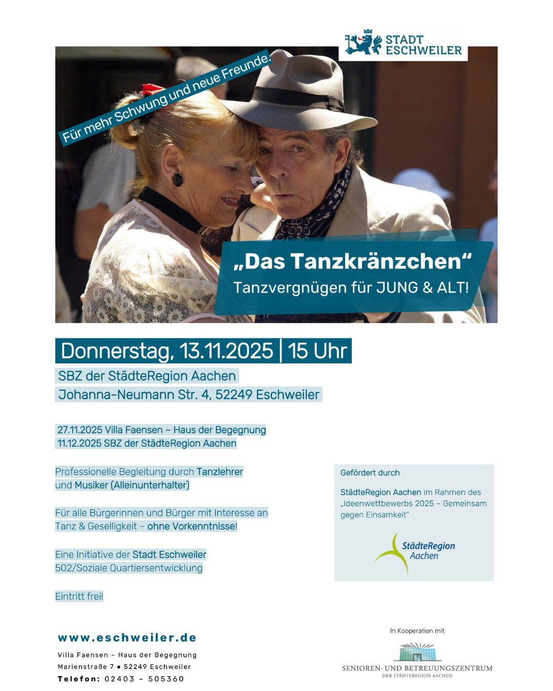 Donnerstag, 13. November 2025 ab 15:00 bis 17:00 Uhr im Senioren- und Betreuungszentrum der Städteregion Aachen (SBZ, Johanna-Neumann-Straße 4)