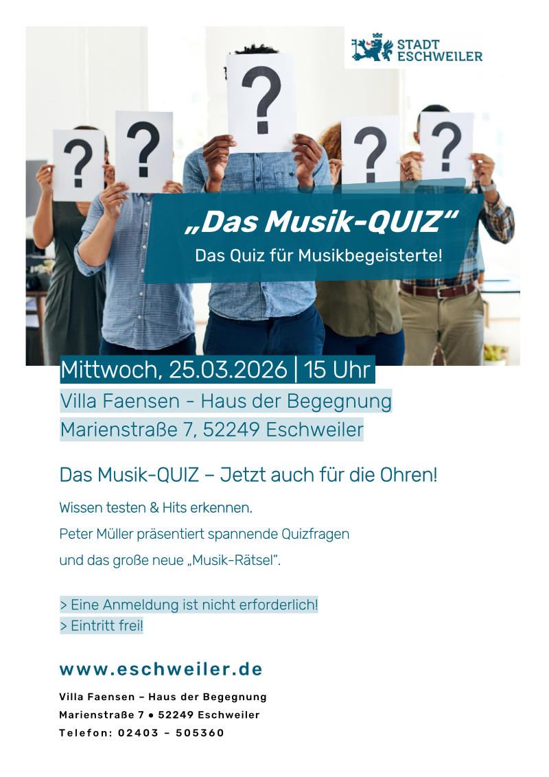 Als Veranstaltungsort dient die Villa Faensen – Haus der Begegnung in der Marienstraße 7, 52249 Eschweiler
